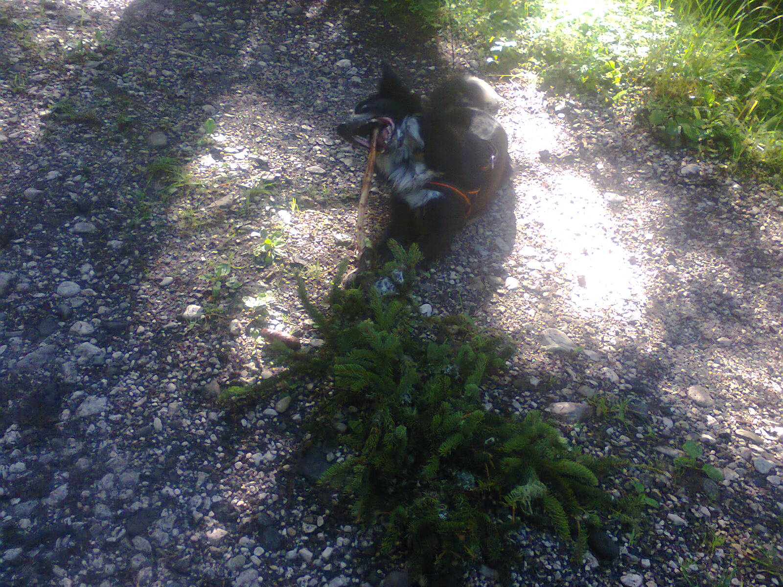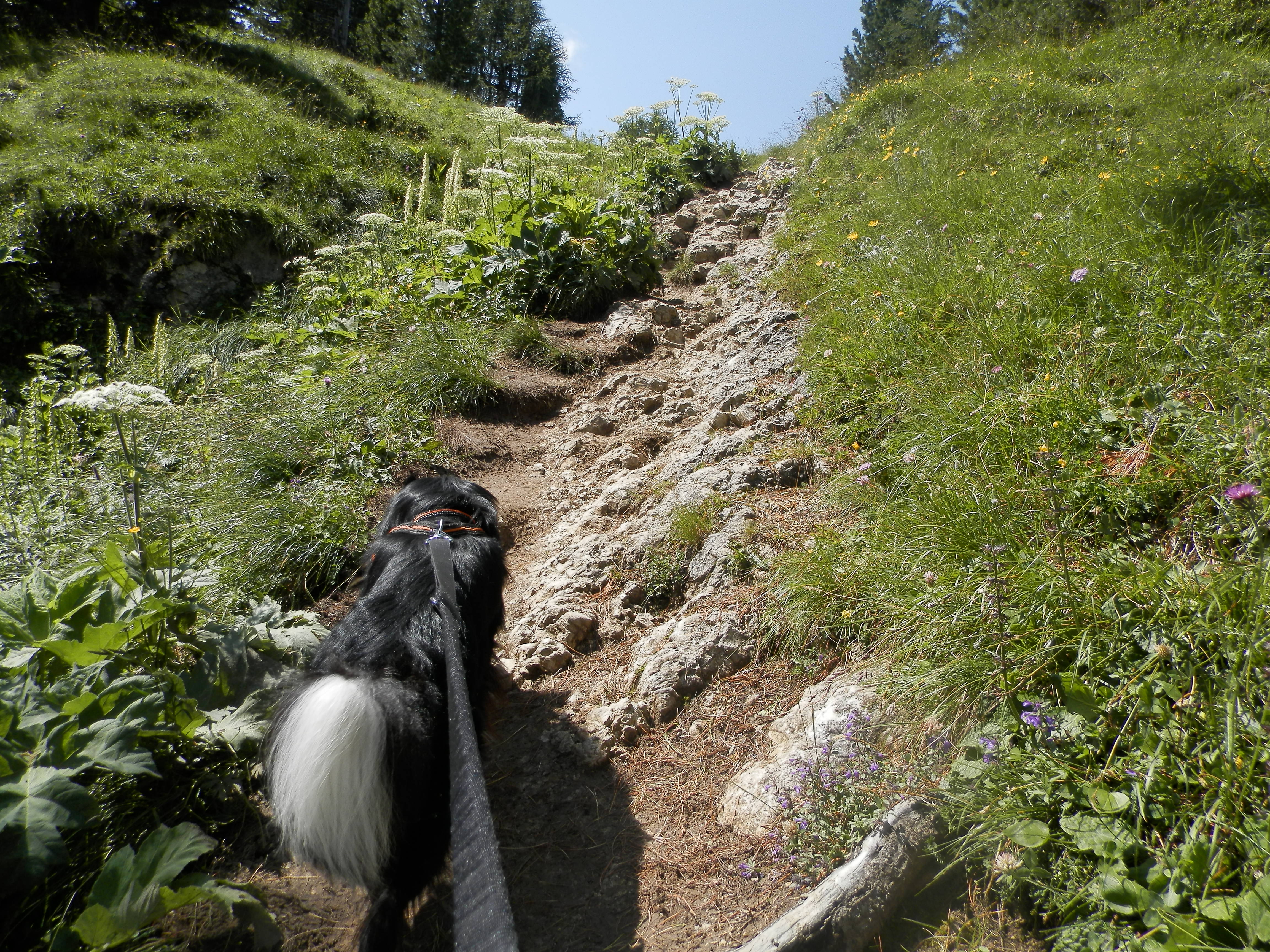 Brik – La Umi è sempre in marcia, ma poiché le hanno parlato del pericolo vipere, per la maggior parte dei sentieri rocciosi e soleggiati mi tiene legato. Si è comprata un’apposita cintura da vita alla quale attacca il guinzaglio. Risultato: quando saliamo mi tocca tirarla su in cordata e per fortuna quando ha messo un piede in fallo l’ho tenuta, altrimenti sarebbe scivolata. Conclusione: la Umi la porto io! Nei passaggi difficili prima passa mio fratello umano, poi io lo raggiungo e quindi mi volto, lancio un abbaio e aspetto che arrivi la Umi. Lei è la solita spacca-pigne e pretende che ubbidisca al “resta” e al “torna” all’istante. L’accontento, non mi costa molto e aspetto di scendere nel bosco: lì sono libero e guido io.